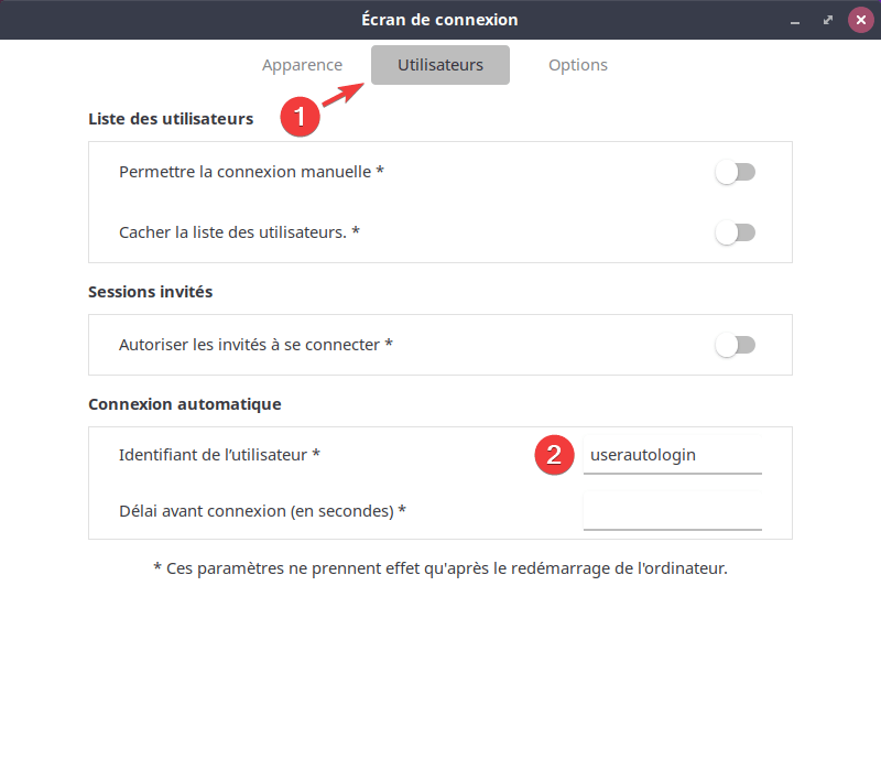 Puis allez dans l’onglet : Utilisateurs (1) et renseignez l’identifiant de l’utilisateur (2) à utiliser pour la connexion automatique.