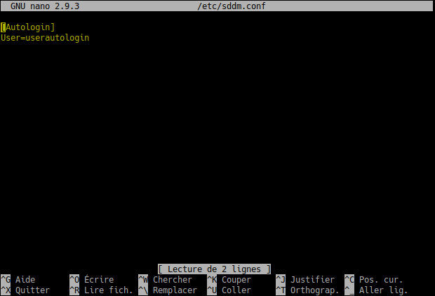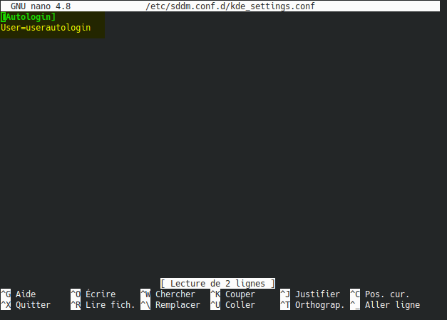 Pour Kubuntu 18.04 et Lubuntu 20.04 : ouvrez le fichier /etc/sddm.conf. Ou, pour Kubuntu 20.04, ouvrez le fichier /etc/sddm.conf.d/kde_setting.conf.