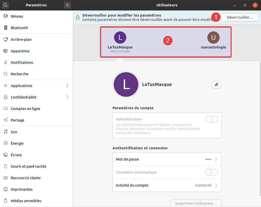 Déverrouillez l’accès aux paramètres (1). Puis sélectionnez l’utilisateur qui servira pour l’auto-login (2)