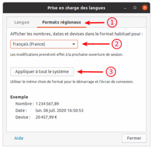 Aussi, dans l’onglet : Formats régionaux (1), vous pouvez changer le pays (2). Ainsi la mise en forme des dates, de la monnaie, etc. correspondra à celui choisi. Et Là aussi, une fois votre choix fait, cliquez sur le bouton Appliquez à tout le système (Apply System-Wide) (3).