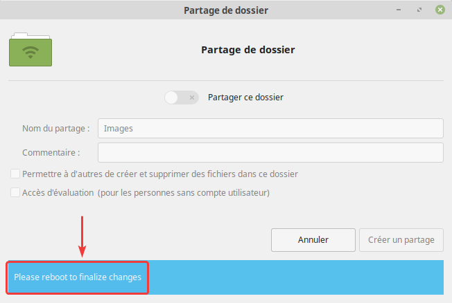 Installation de Samba depuis la fenêtre d’option de partage de dossier (sur Cinnamon)