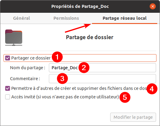 Pour créer un partage réseau dans Ubuntu, allez dans le navigateur de fichier et faites un clic droit de la souris sur le dossier à partager. Alors dans le menu choisissez Propriétés puis onglet Partager (1). Alors, paramétrez votre partage.