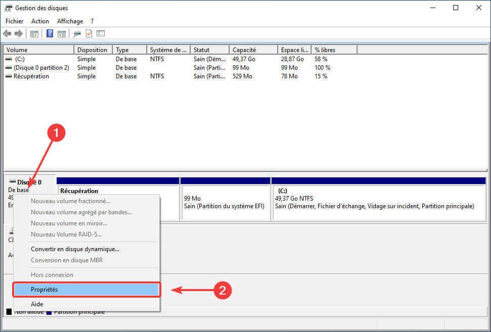 Mais pour avoir confirmation, faites un clic droit sur le disque (1) puis allez dans les propriétés (2) :