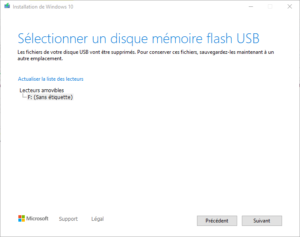 Enfin, sélectionnez votre clé USB et lancez la création du support d’installation Windows 10 :