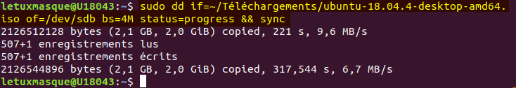 of=/dev/sdX : à adapter avec le device correspondant à votre clé USB (exemple : sdb)