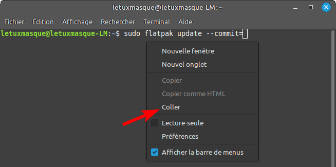 Les informations récupérées précédemment (Application ID et le code de commit) vont servir dans la commande utilisée pour rétrograder (downgrader) la version d’un paquet flatpak.