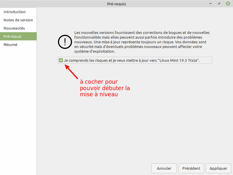 Arrivé à la fenêtre Pré-requis, cochez : Je comprends les risques et je veux mettre à jour vers « Linux Mint 19.3 Tina ». Puis cliquez sur Appliquer. Et entrez alors votre mot de passe administrateur pour lancer l’installation.