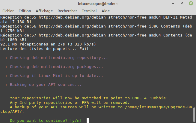 Lors de la vérification, une copie de vos dépôts sera faite dans votre répertoire personnel ~/Upgrade-Backup.