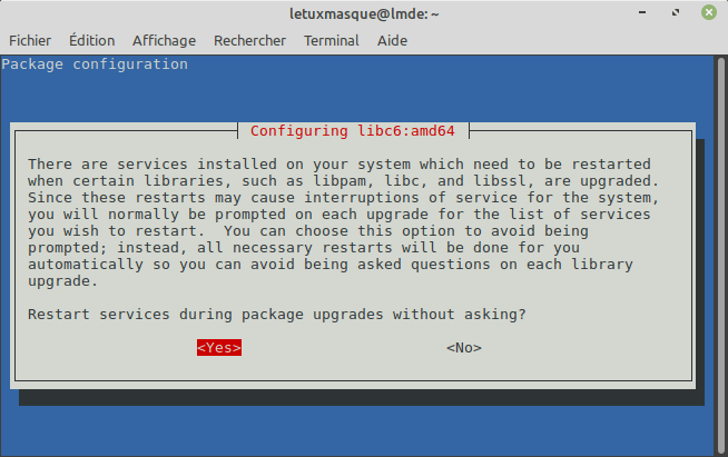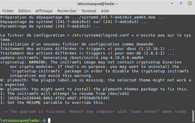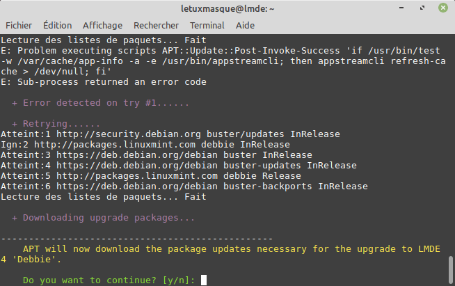 En cas de problème, déconnectez vous complètement et passez en mode console avec Ctrl + Alt + F1. Puis identifiez vous. Et alors, relancez la mise à niveau avec la commande :