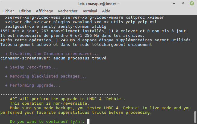 Cette mise à niveau est lourde et peut prendre du temps. Aussi, il se peut que par moment votre système ou Cinnamon se gèlent. Pas d’inquiétude, soyez juste patient.