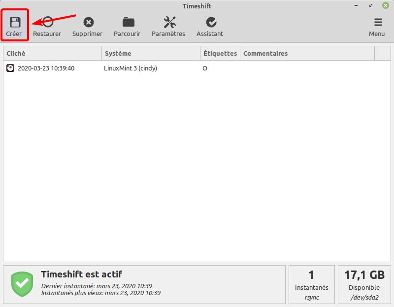 - de votre système. Timeshift est prévu pour cela dans LMDE (Menu > Administration > Timeshift). Une fois configuré si vous ne l’aviez pas déjà fait, lancez la création d’un instantané en cliquant sur Créer.