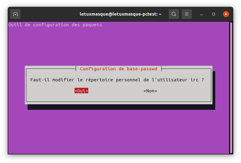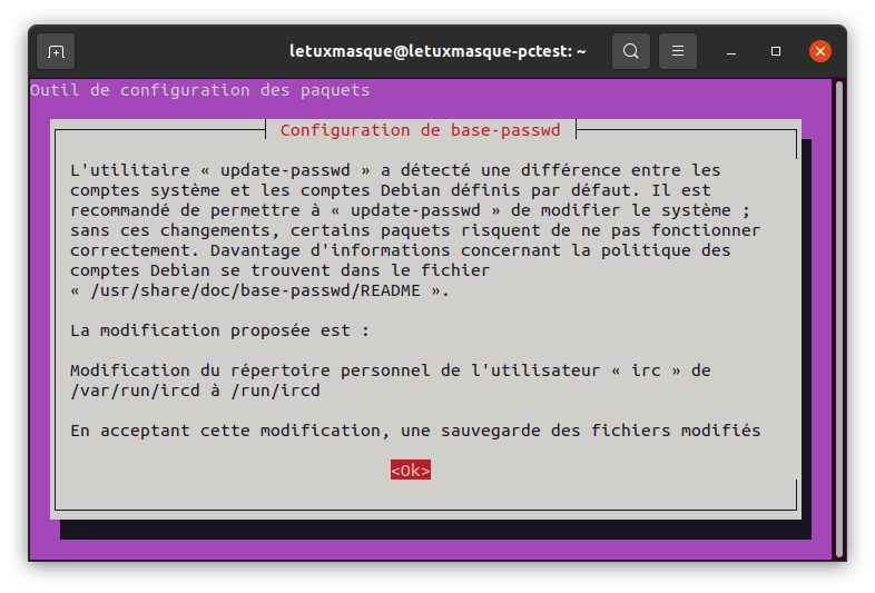 Pendant la mise à niveau, vous devrez valider un changement le changement de répertoire pour l’utilisateur irc. (coché par défaut)