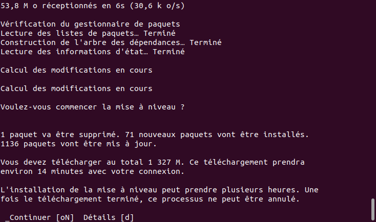 L’opération de mise à niveau peut prendre du temps. Sa durée dépend de votre débit internet (il vaut mieux avoir du haut débit), de la puissance de votre machine, des paquets installés, etc.