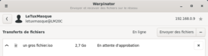 Warpinator est un utilitaire pour échanger facilement par le réseau (local) des fichiers entre deux ordinateurs sous Linux.