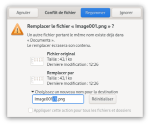 - Lors du déplacement ou de la copie d’un fichier si la destination contient déjà un fichier de même nom, il est la possibilité de renommer le nouveau fichier :
