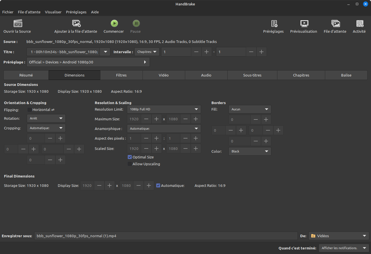 Pour les connaisseurs, Handbrake propose diverses options pour configurer, notamment, les dimensions, le codage et les filtres vidéos, les pistes audio, les sous-titres et chapitres, etc.