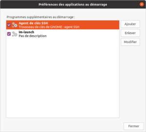 Vous trouverez le gestionnaire des Applications au démarrage dans Menu > Applications > Préférences > Applications au démarrage :