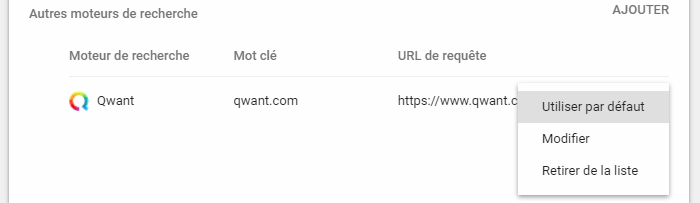 Une fois que vous avez ajouté le moteur de recherche à la liste, cliquez sur l’icône sur la ligne correspondante. Puis sur Utiliser par défaut.