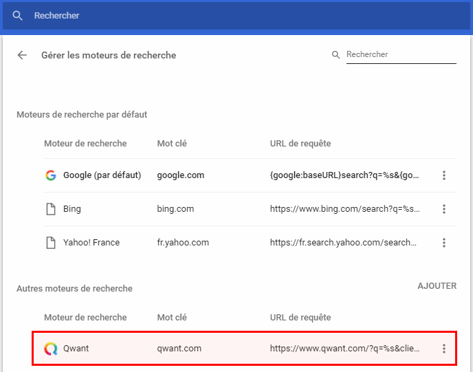 Rendez-vous à l’adresse internet du moteur de recherche que vous souhaiter ajouter. Pour les exemples, je vais ajouter Qwant, mais c’est valable avec tout autre moteur de votre choix. Puis, allez dans les paramètres de votre navigateur et descendez jusqu’à la section Moteur de recherche.