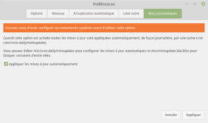 C’est pourquoi, lors de la première utilisation de l’Update Manager, il vous est proposé (barre orange en haut de la fenêtre) de configurer les instantanés de Timeshift.