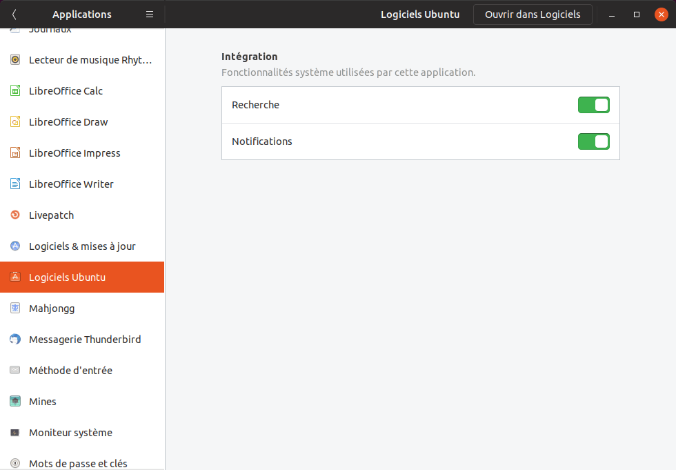 Et, ce panneau permets de contrôler les permissions pour chaque application (notifications, type au fichiers,…)