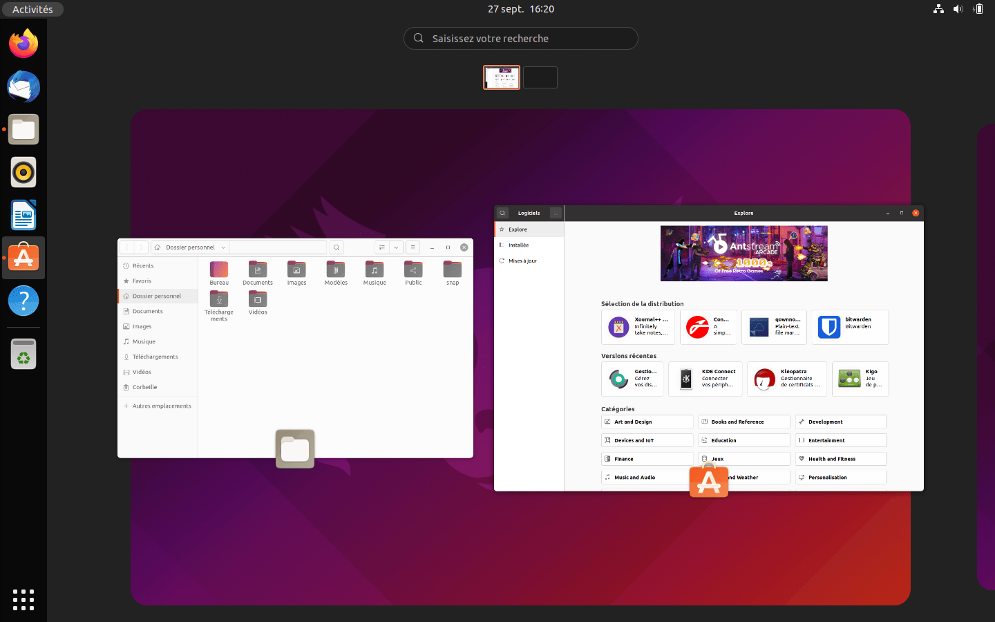 Le Ubuntu Software qui est un fork du GNOME Software passe aussi en version 40, mais avec une interface légèrement différente de l’original. En effet, un panneau vertical remplace la barre de menu horizontale…