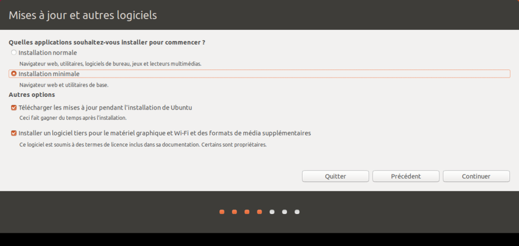 Lors de l’installation d’Ubuntu 18.04, vous aurez maintenant la possibilité de faire une installation minimale. S »installeront alors seulement le système d’exploitation, le navigateur Firefox et quelques utilitaires de bases.