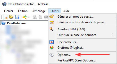 Pour vérifier l’installation de KeePassRPC, lancez KeePass puis allez dans le menu : Outils (Tools). Alors, si tout va bien, vous constaterez l’ajout d’une ligne KeePassRPC.